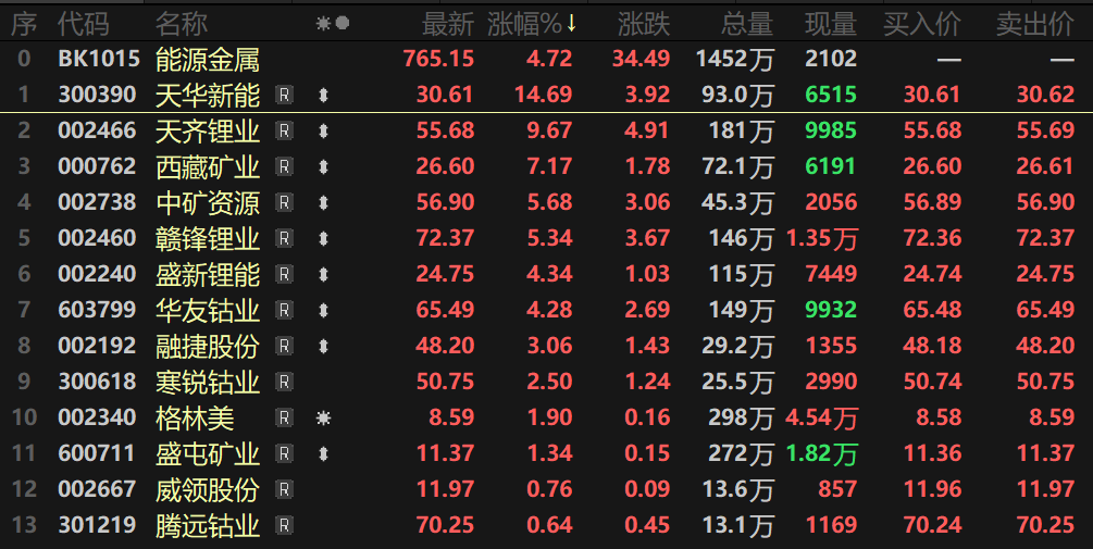 SMM 10月30日讯:10月30日,能源金属板块午后快速拉升,指数盘中一度涨逾5%,在一众行业板块中排名前列,能源金属指数今日盘中更是一度触及776.28的高位,刷新2023年2月10日以来的新高。个股方面,天华新能涨逾15%,天齐锂业盘中封死涨停板,西藏矿业、赣锋锂业、中矿资源、盛新锂能等多股涨逾5%。