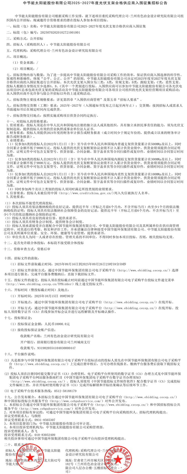 10月29日,中节能太阳能2025-2027年度光伏支架合格供应商入围征集中标结果公布,12家企业中标,分别是特变电工集团(天津)新能源科技有限公司、江苏中信博新能源科技股份有限公司、中电建成都铁塔有限公司、天津鑫润恒信新能源科技发展有限公司、天合光能股份有限公司、青岛迪乐普精密机械有限公司、上海摩昆新能源科技有限公司、杭州帷盛科技有限公司、南昌南飞防火设备制造有限公司、清源科技(厦门)股份有限公司、南京市光翔新能源科技有限公司等。