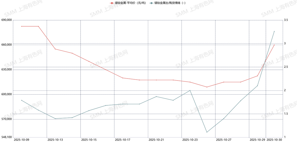 10月30日,中国领导人前往韩国釜山参加APEC会议,并与美国总统特朗普会晤,双方就半导体和稀土贸易等议题进行了深入讨论,落实了吉隆坡经贸会谈达成的共识。美方承诺暂停对中国商品加征100%关税的计划,作为回应,中国决定将稀土出口管制措施推迟一年执行。这一消息显著提振了市场信心,导致镨钕金属低价货源迅速收紧。同时,氧化物成本上升也推动了镨钕金属价格的攀升。在市场看涨情绪的带动下,下游磁材企业的询单情况有所改善,但由于需求传导需要时间,目前磁材企业的订单量尚不足以支撑高价镨钕金属,因此询单价格普遍较低,采购策略以寻低为主。这使得下午镨钕金属价格出现小幅回落。由于10月份整体市场交投不佳,金属企业面临较大的销售压力。随着市场信心逐渐恢复,市场询单情况出现好转,金属企业出货意愿增强,主动降价出货,虽导致镨钕金属价格出现小幅回落,但市场交投情况有所好转。