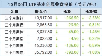 伦敦时间10月30日17:00(北京时间10月31日01:00),LME三个月期铜下跌266.5美元,或2.38%,收报每吨10,917.0美元。周三因供应担忧触及11,200美元的纪录高位。