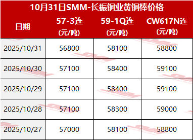 【SMM价格】2025年10月31日长振黄铜棒价格
