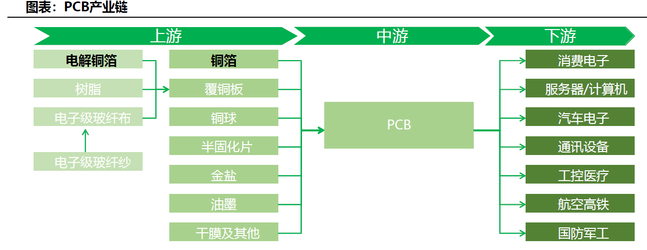 PCB行业上游为铜箔、电子级玻纤布、树脂、油墨、覆铜板等原材料行业, 中游为PCB的生产制造行业, 下游广泛应用于通讯、网络、计算机、服务器等领域。电子纱行业、电子布行业、覆铜板行业、PCB属于产业链上紧密相连、相互依存的上下游基础材料行业。