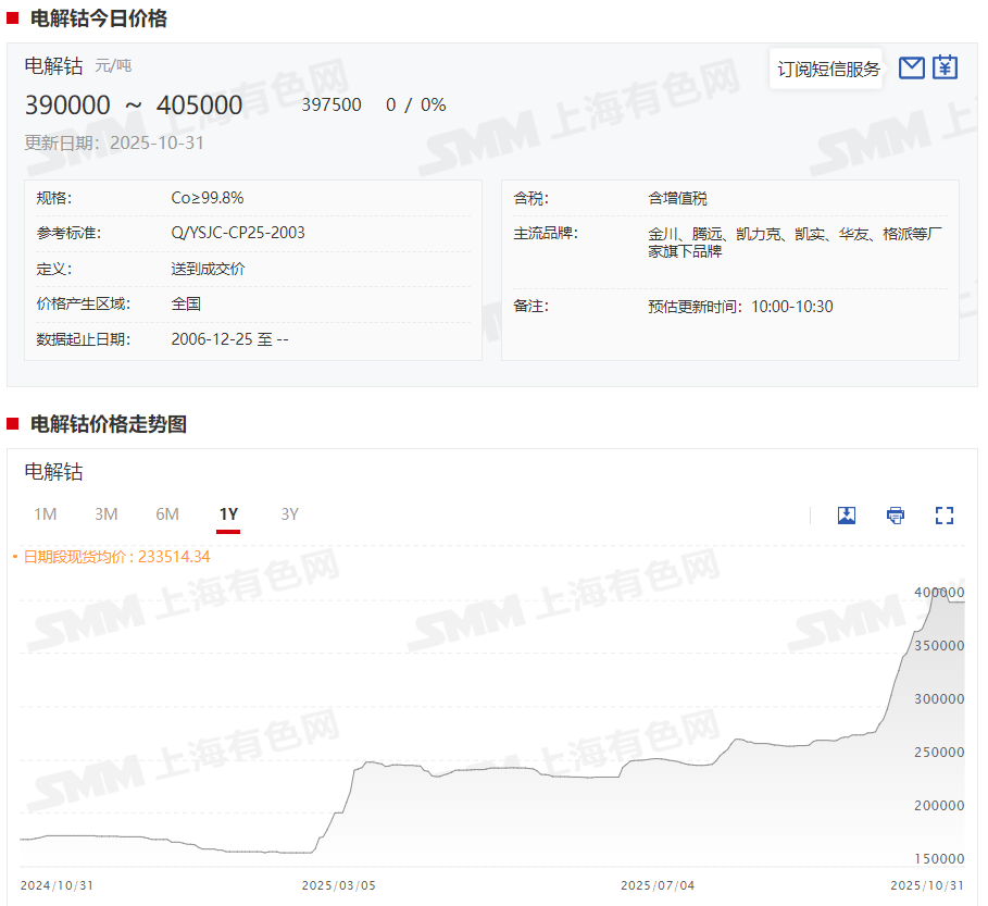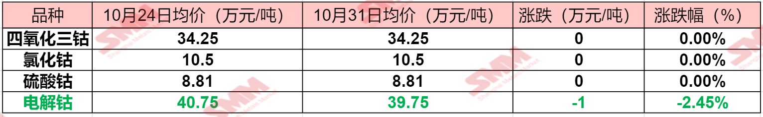 据SMM现货报价显示,本周电解钴现货报价在经历周初的下跌后持稳运行,截至10月31日,电解钴现货报价维持在39~40.5万元/吨,均价报39.75万元/吨,较10月24日下跌1万元/吨,跌幅达2.45%。