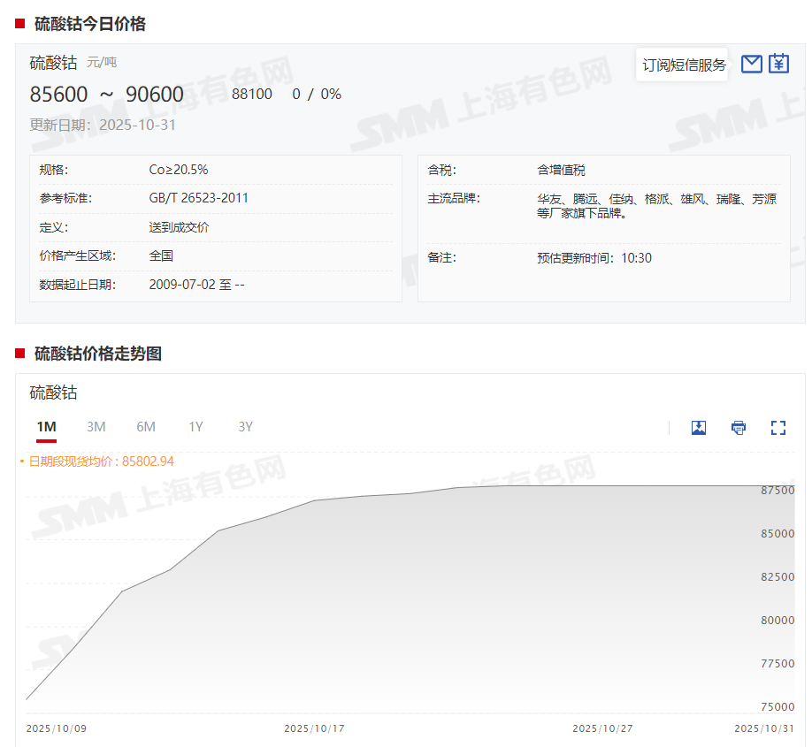 据SMM现货报价显示,本周硫酸钴现货报价持稳运行,截至10月31日,硫酸钴现货报价维持在8.56~9.06万元/吨,均价报8.81万元/吨,较10月24日未出现明显波动。