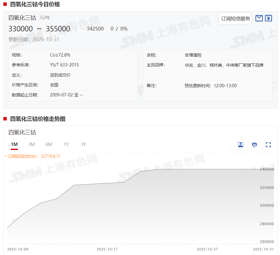 本周四氧化三钴市场也在持续上涨后迎来“喘息”,截至10月31日,四氧化三钴现货报价维持在33~35.5万元/吨的价位,均价报34.25万元/吨,较10月24日持稳运行。