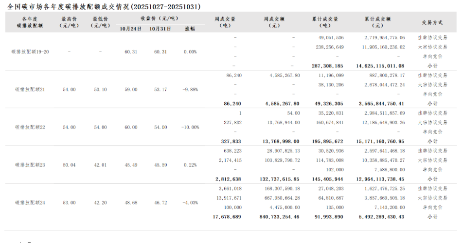 2025年1月1日至10月31日,全国碳市场碳排放配额成交量139,661,332吨,成交额8,785,796,587.81元。