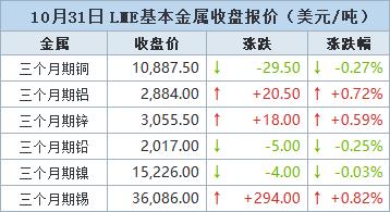 伦敦时间10月31日17:00(北京时间11月1日01:00),LME三个月期铜下跌29.5美元,或0.27%,收报每吨10,887.5美元。这是在周三触及11,200美元高点后的第二天下跌。