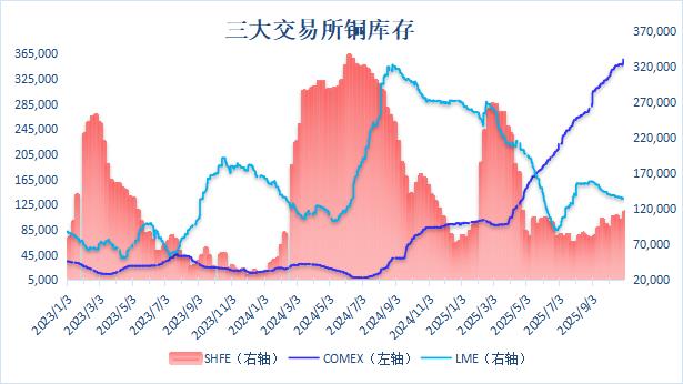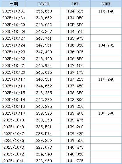 以下为2025年10月以来三大交易所铜库存数据:(单位:吨)