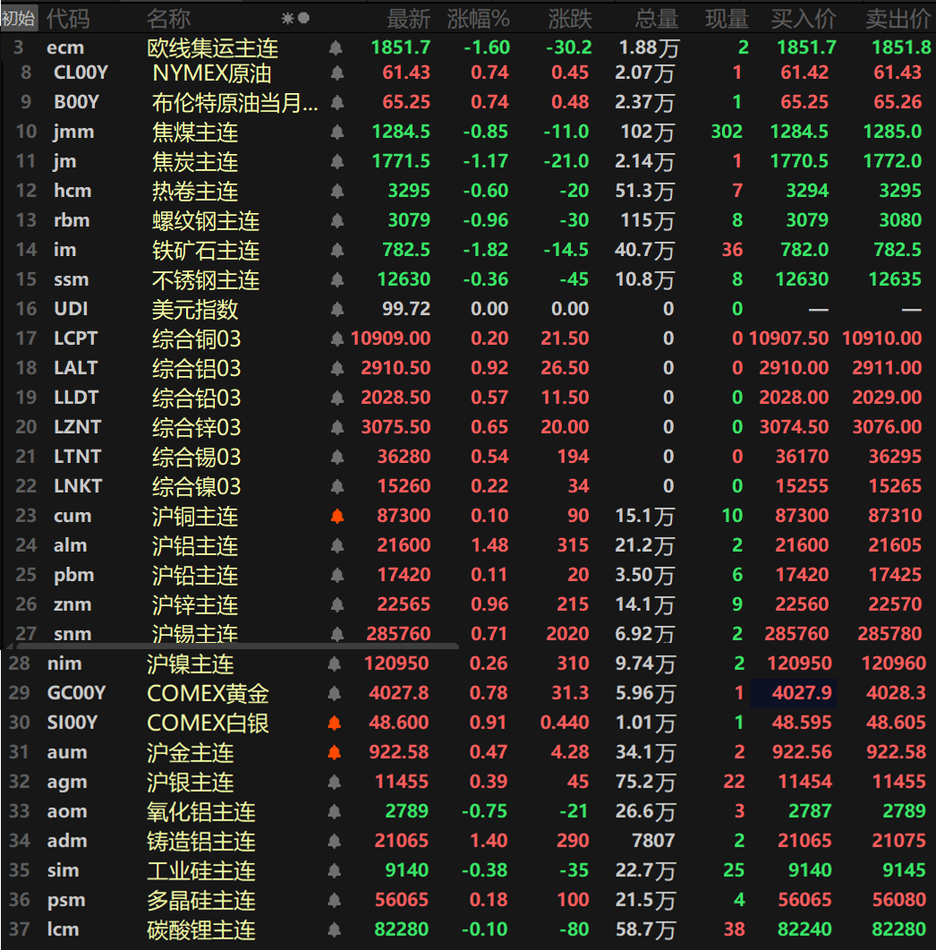 此外,碳酸锂主连跌0.1%,工业硅主连跌0.38%,多晶硅主连涨0.18%。欧线集运主连跌1.6%报1851.7。
