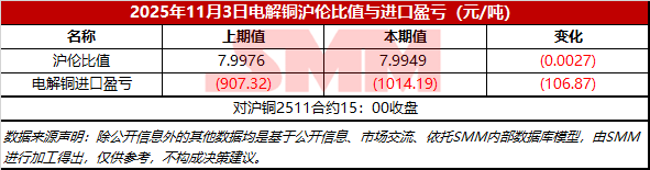 2025年11月3日电解铜沪伦比值与进口盈亏【SMM价格】