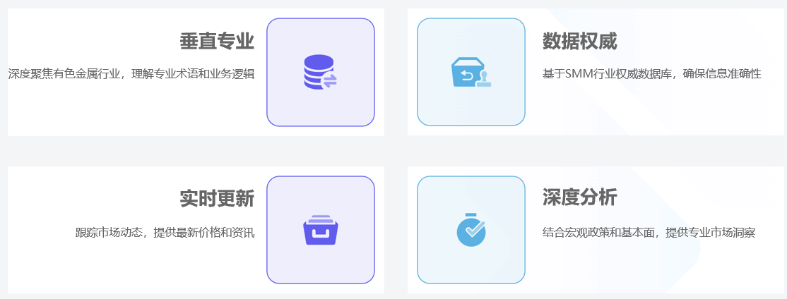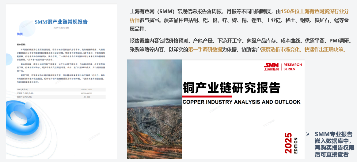 上海有色网(SMM)常规信息报告含周报、月报等不同时间跨度,由150多位上海有色网资深行业分析师参与撰写。覆盖品种包括铜、铝、铅、锌、镍、锡、锂电、工业硅、稀土、钢铁、铁矿石、锰等金属品种。