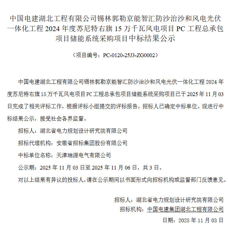 北极星储能网获悉,11月3日,中国电建湖北工程有限公司锡林郭勒京能智汇防沙治沙和风电光伏一体化工程2024年度苏尼特右旗15 万千瓦风电项目PC工程总承包项目储能系统采购项目中标结果公示,天津瑞源电气有限公司中标该项目。
