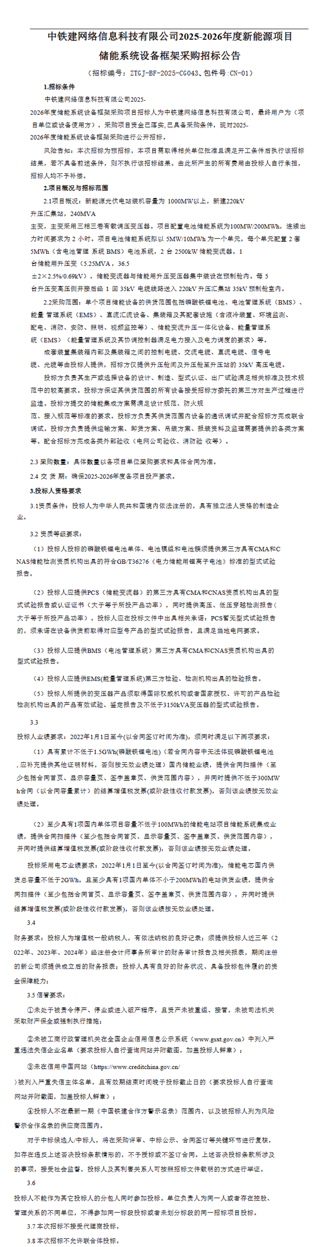 11月2日,中铁建网络信息科技有限公司2025-2026年度新能源项目储能系统设备框架采购招标公告发布。项目配置电池储能系统为100MW/200MWh,拟以 5MW/10MWh为一个单元,每个单元配置2套5MWh(含电池管理 系统 BMS)电池系统,2 台 2500kW储能变流器,1台储能用升压变(5.25MVA,36.5±2x2.5%/0.69kV),储能变流器与储能用升压变压器集中装设在预制舱内。每5台升压变高压侧并接后经1回 35kV 电缆线路送入 220kV升压汇集站 35kv 预制舱室内。