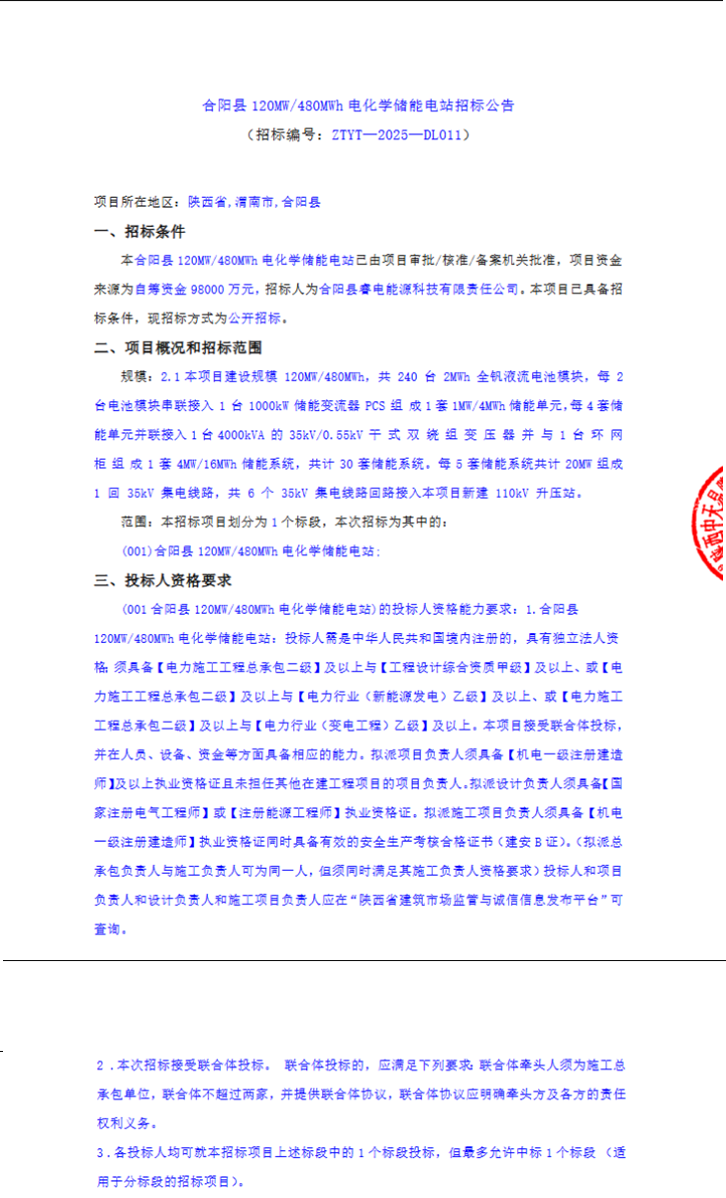 10月31日,陕西采购与招标网发布“合阳县120MW/480MWh电化学储能电站招标公告”,该项目由合阳县容电能源科技有限责任公司组织公开招标,资金来源为自筹,估算总投资9.8亿元。