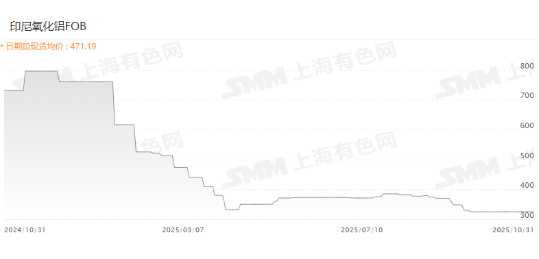 图1:印尼氧化铝FOB(美元/吨)价格走势(2024年10月31日 – 2025年10月31日)