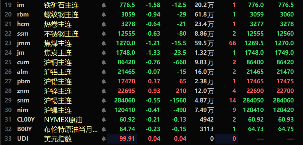 黑色系均飘绿,铁矿跌1.58%,螺纹跌0.94%,热卷跌0.64%,不锈钢跌0.63%。双焦方面:焦煤主力合约跌1.21%,焦炭主力合约跌1.33%。
