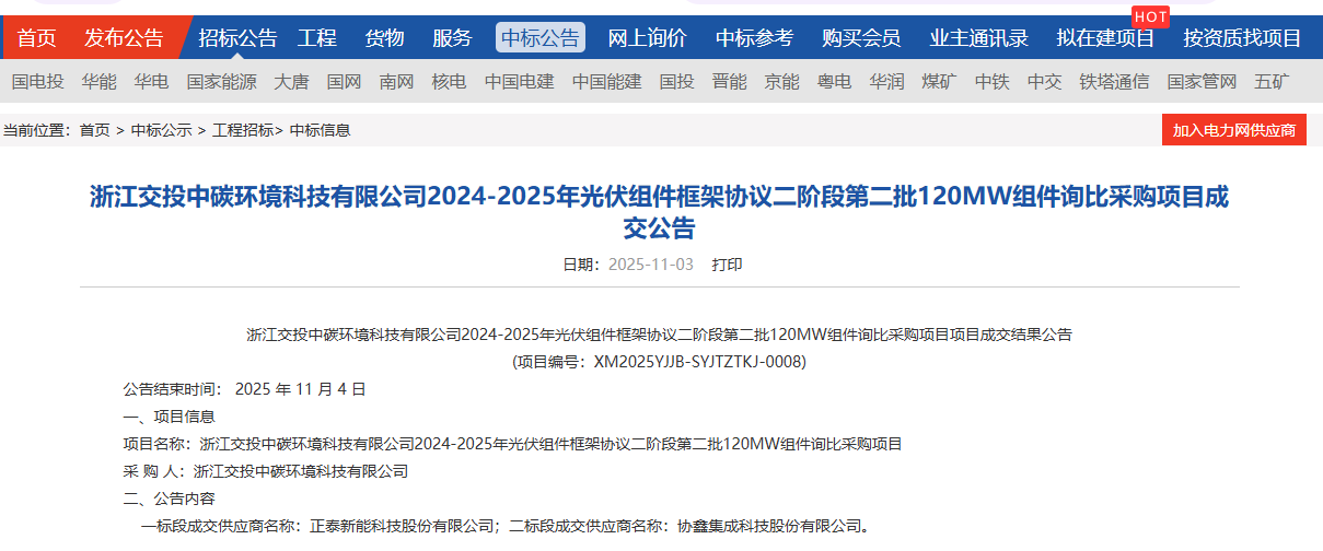 11月3日,浙江交投中碳环境科技有限公司2024-2025年光伏组件框架协议二阶段第二批120MW组件询比采购项目成交公告发布,一标段成交供应商为正泰新能科技股份有限公司、二标段成交供应商为协鑫集成科技股份有限公司。