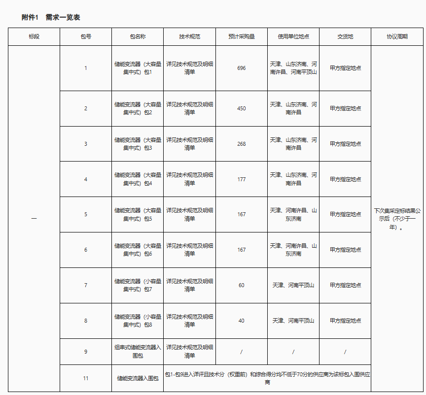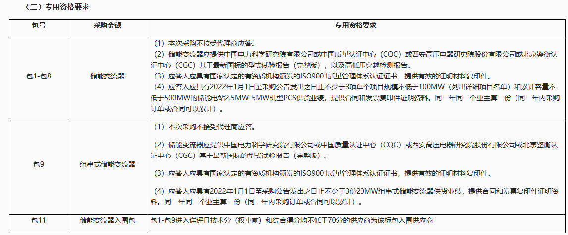 包11:储能变流器入围包,包1-包9进入详评且技术分(权重前)和综合得分均不低于70分的供应商为该标包入围供应商。