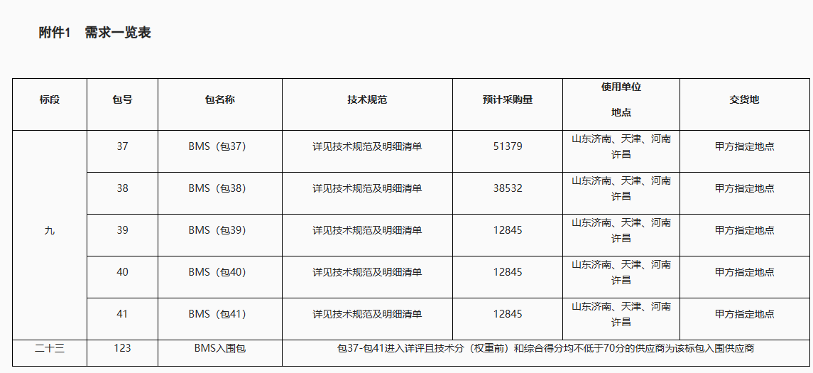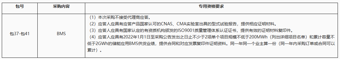 包37-包41:12.8446万套BMS,要求应答人应具有2022年1月1日至采购公告发出之日止不少于2项单个项目规模不低于200MWh(列出详细项目名单)和累计容量不低于2GWh的储能应用BMS供货业绩;