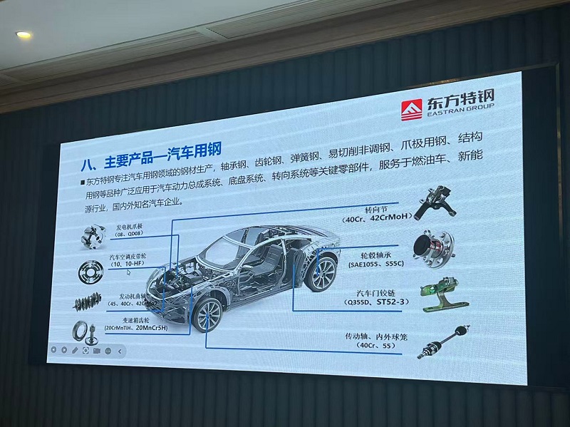 双方围绕新能源汽车产业发展趋势,聚焦汽车用特钢的行业现状、机遇挑战与未来方向,展开了深入且富有建设性的友好洽谈。作为践行集团 “精品、绿色、安全” 三大战略的标杆企业,东方特钢引入国际前沿炼钢、轧钢、精整及环保设备,构建起智能化绿色制造体系,形成优特钢精品棒材、高品质连铸圆坯两大核心产品系列,年产能达 330 万吨,广泛服务于汽车、工程机械、交通、能源等多个领域,市场覆盖长三角、珠三角、川渝地区及海外市场。
