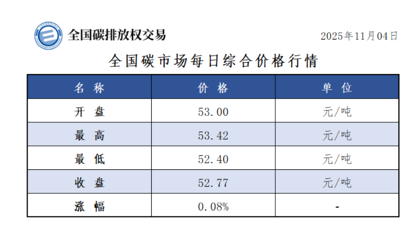 今日全国碳市场综合价格行情为: 开盘价53.00元/吨,最高价53.42元/吨,最低价52.40元/吨,收盘价52.77元/吨,收盘价较前一日上涨0.08%。