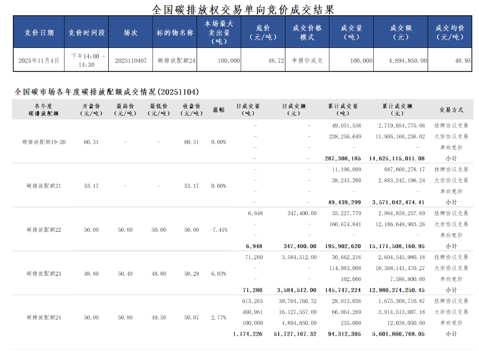 截至2025年11月4日,全国碳市场碳排放配额累计成交量772,709,633吨,累计成交额51,949,800,664.94元。