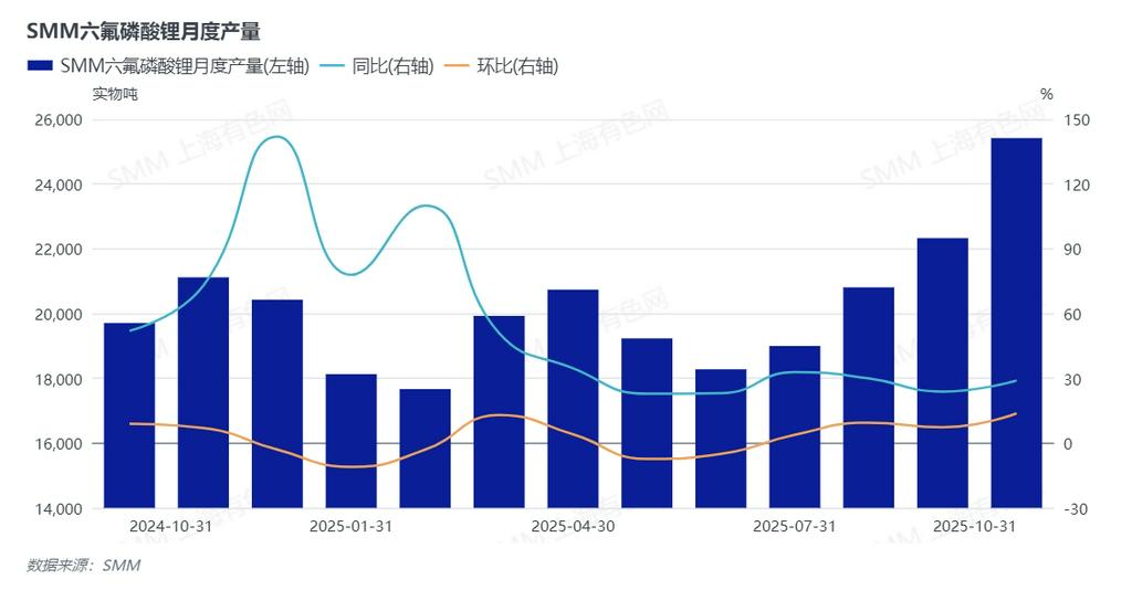 2025 年 10 月,中国六氟磷酸锂产量环比上涨约 13.8%,同比上升约 29%。