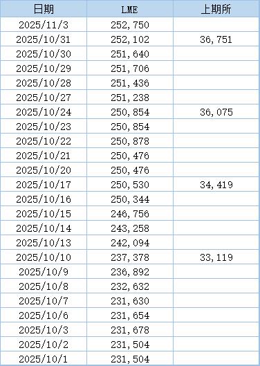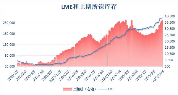 以下为2025年10月以来LME和上期所镍库存数据:(单位:吨)