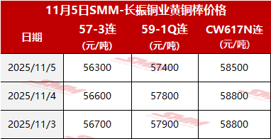 【SMM价格】2025年11月5日长振黄铜棒价格
