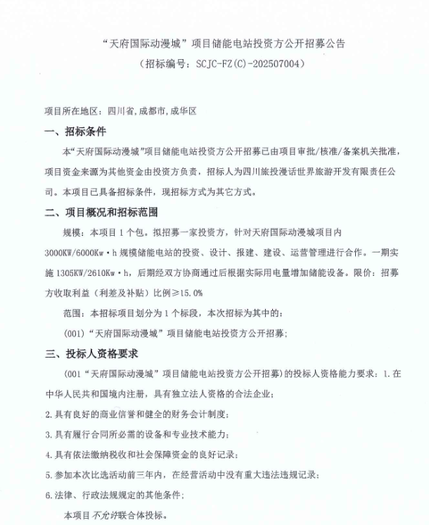 11月4日,四川旅投漫话世界旅游开发有限责任公司发布“天府国际动漫城”项目储能电站投资方公开招募公告。本项目1个包,拟招募一家投资方,针对天府国际动漫城项目内3000kW/6000kW·h规模储能电站的投资、设计、报建、建设、运营管理进行合作。一期实施1305kW/2610kW·h,后期经双方协商通过后根据实际用电量增加储能设备。