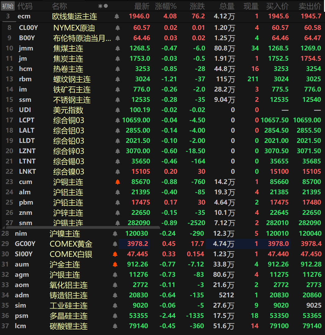 此外,碳酸锂主连跌0.45%,多晶硅主连跌2.44%,录得三连阴。工业硅主连跌0.06%。欧线集运主连涨4.08%报1946。