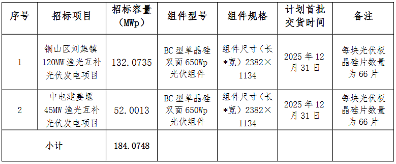 从中国电建阳光采购网获悉,11月5日,中国电建铜山区刘集镇120MW、姜堰45MW渔光互补光伏组件采购项目招标公告发布,采购BC型单晶硅双面光伏组件,功率为650Wp,招标容量184.0748MW。