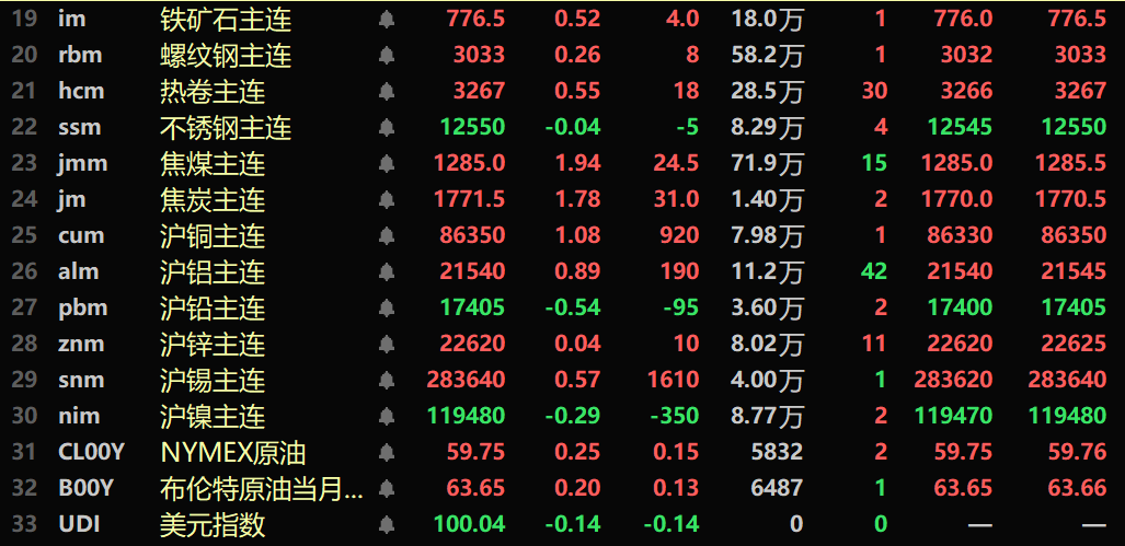 黑色系多飘红,铁矿涨0.52%,螺纹涨0.26%,热卷涨0.55%,不锈钢微跌。双焦方面:焦煤主力合约涨1.94%,焦炭主力合约涨1.78%。