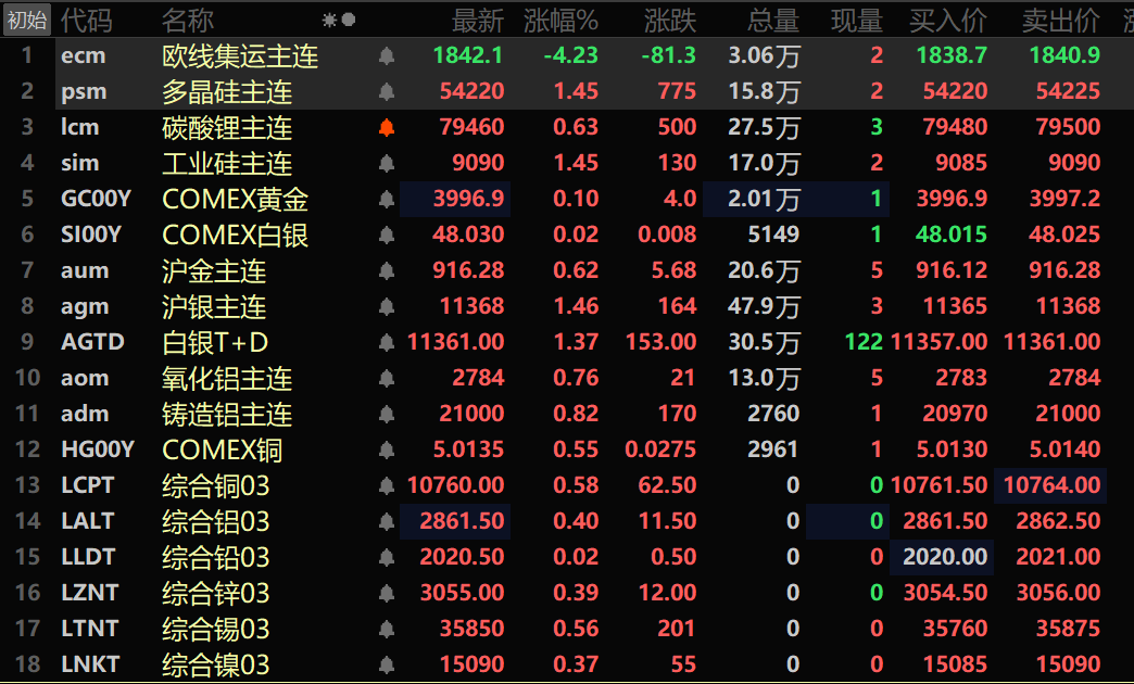 此外,铸造铝主连期货涨0.82%,氧化铝主连涨0.76%。碳酸锂主连涨0.63%,工业硅主连涨1.45%。多晶硅主连涨1.45%。