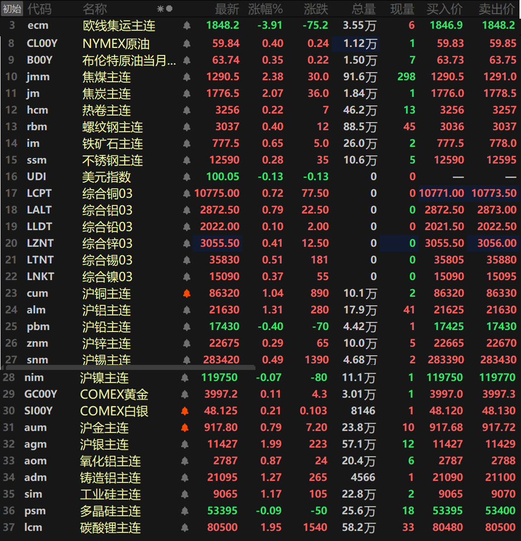 此外,碳酸锂涨1.95%,工业硅涨1.17%,多晶硅跌0.09%。欧线集运主连跌3.91%报1848.2。