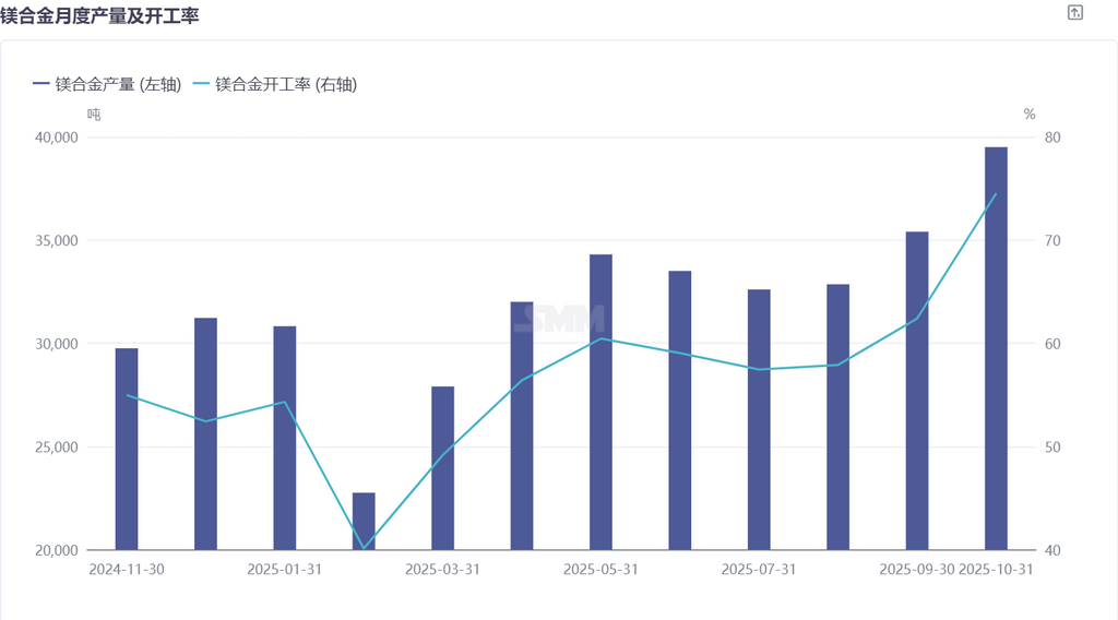 SMM数据显示,2025年10月中国镁合金产量环比上调19.49%,同比增长36.01,累计同比增长10.78%,10月镁合金开工率上调至74.54%。