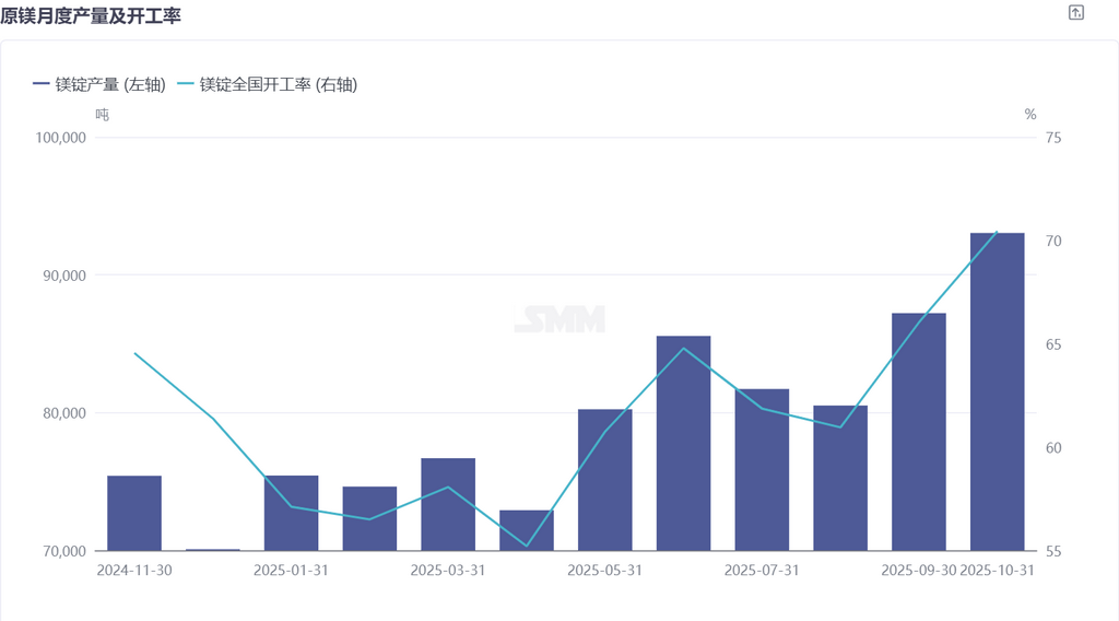 根据SMM数据显示,2025年10月中国原镁产量环比增长6.67%,开工率上调至70.44%。
