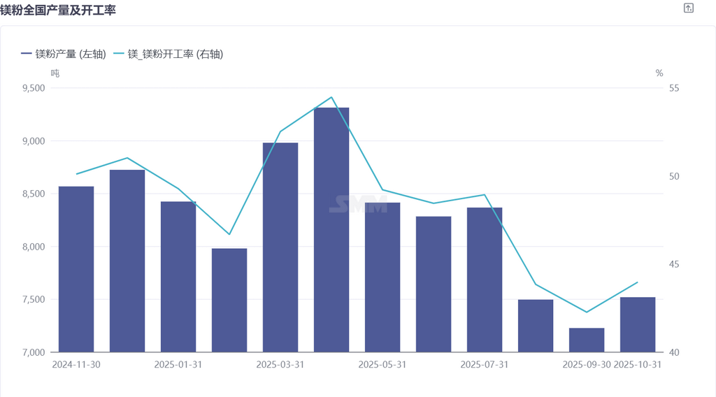 根据SMM数据显示,2025年10月中国镁粉产量环比增长4.04%,开工率上调至43.96%。