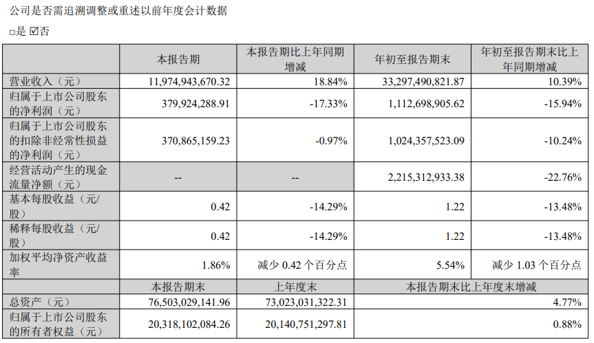 此前,公司发布2025年三季报,其中提到,公司第三季度实现营业收入119.75亿元,同比增长18.84%;归属于上市公司股东的净利润3.8亿元,同比下降17.33%;前三季度,公司共实现营业收入332.97亿元,同比增长10.39%;归属于上市公司股东净利润11.13亿元,同比下滑15.94%。