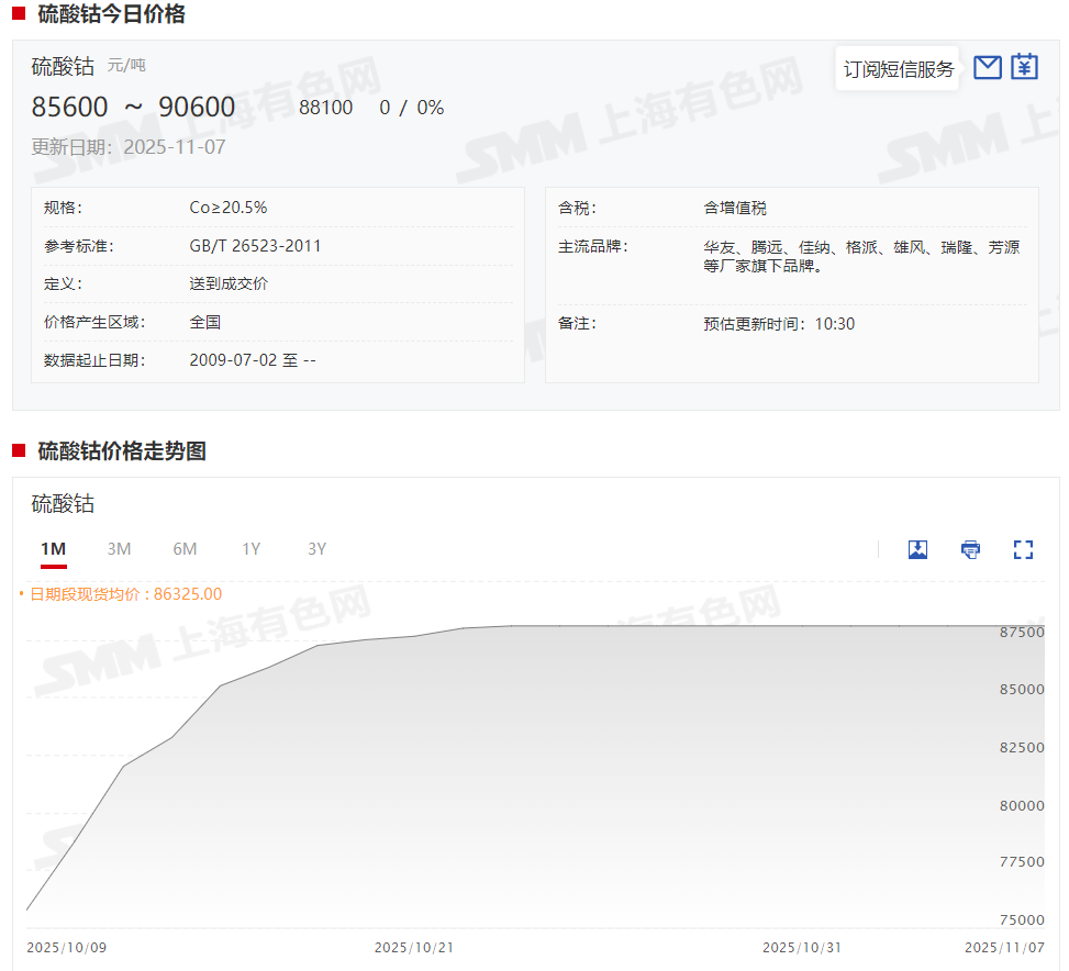据SMM现货报价显示,本周硫酸钴市场依旧维持稳定,截至11月7日,硫酸钴现货报价维持在8.56~9.06万元/吨,均价报8.81万元/吨,较10月31日报价持平。