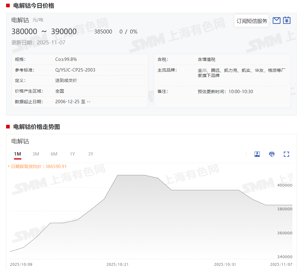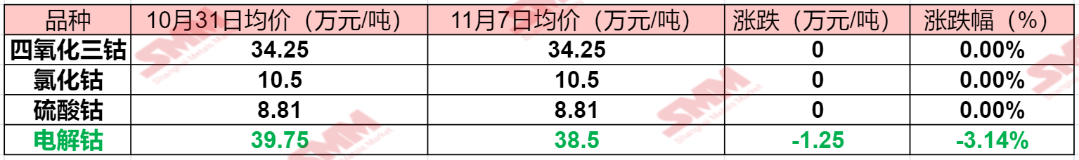 SMM 11月7日讯:本周钴系产品价格整体维持稳定,除了上游原料端钴中间品价格持续强势之外,其余环节产品多维持稳定。不过电解钴现货报价许是受资金影响,导致其价格继续下跌,单周跌去1.25万元/吨……SMM整理了本周钴系产品相关价格变动情况,具体如下: