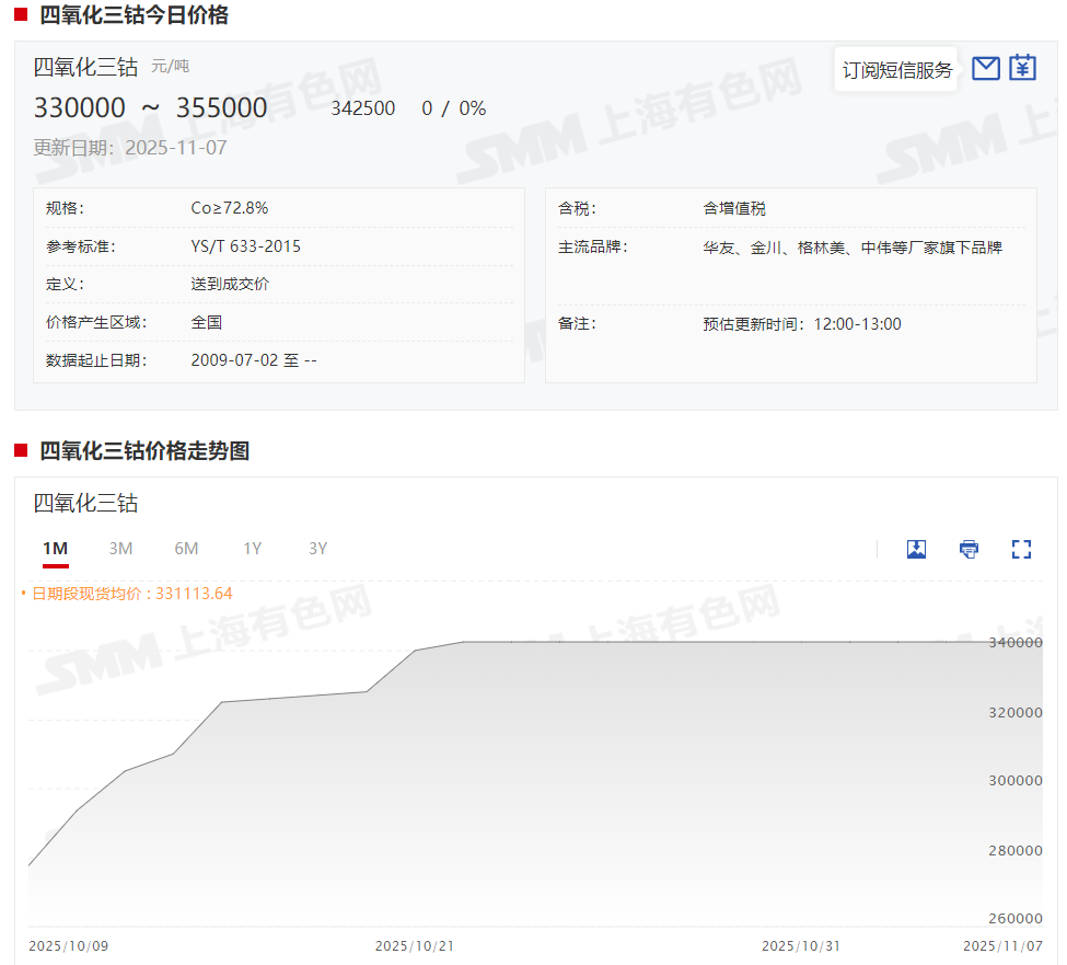 据SMM现货报价显示,本周四氧化三钴也呈现高位维稳的态势,截至11月7日,四氧化三钴现货报价持稳于33~35.5万元/吨,均价报34.25万元/吨,较10月31日持稳运行。