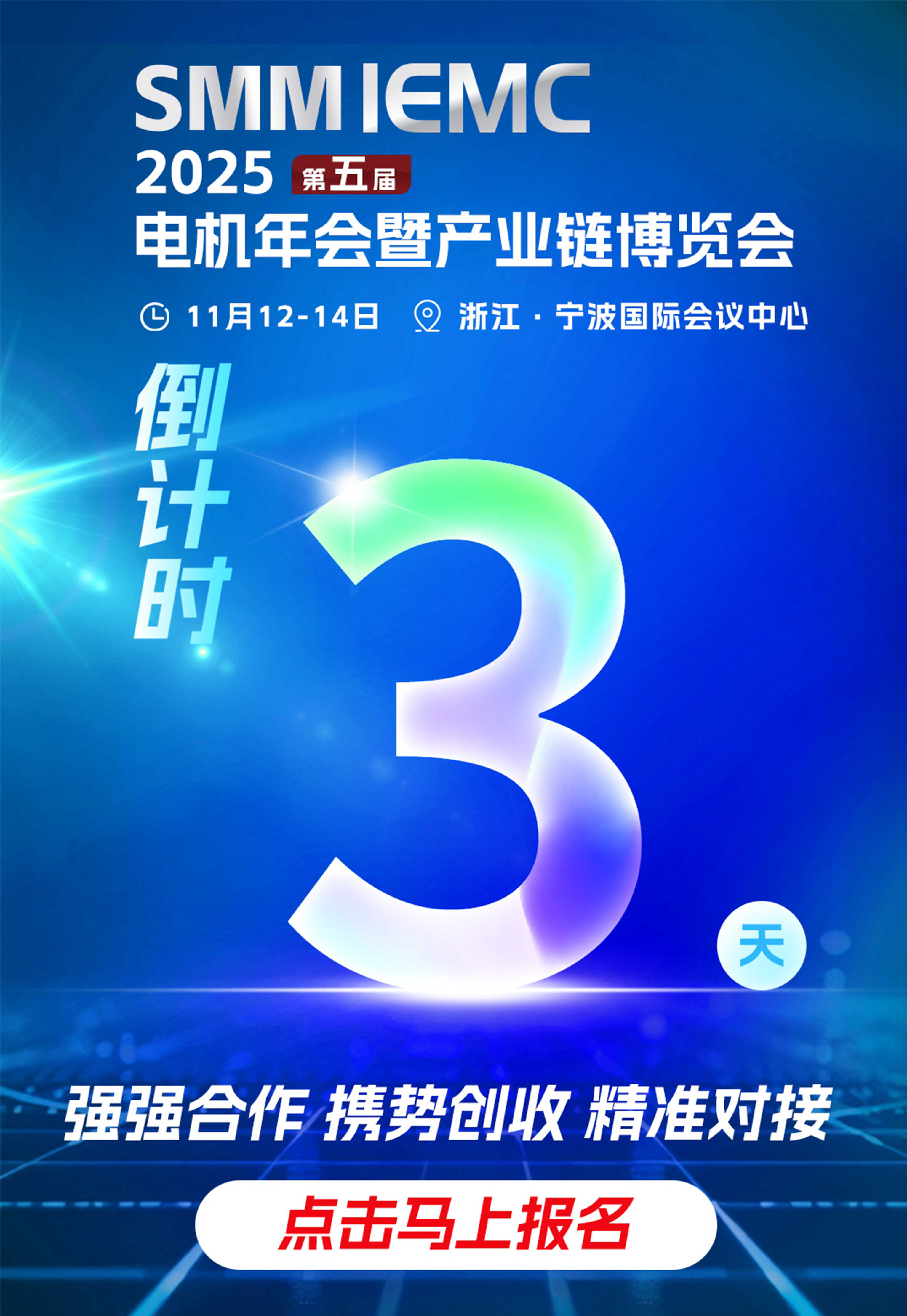 2025年11月12-14日,SMM 2025 IEMC(第五届)电机年会暨产业链博览会在浙江·宁波国际会议中心盛大启幕!本届展会深度赋能电机全产业链生态,全维展示电机/电机控制系统及装置/线圈配套及材料/机器人/测试仪器及设备等核心领域!创新打造3大主题活动+7大行业论坛矩阵。即刻点击报名,与行业同仁携手共创电机产业更加灿烂的未来!