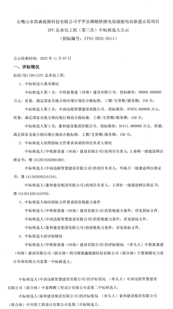 北极星储能网获悉,11月4日,石嘴山市简森能源科技有限公司平罗县磷酸铁锂电池储能电站新建示范项目EPC总承包工程(第三次)中标候选人公示。