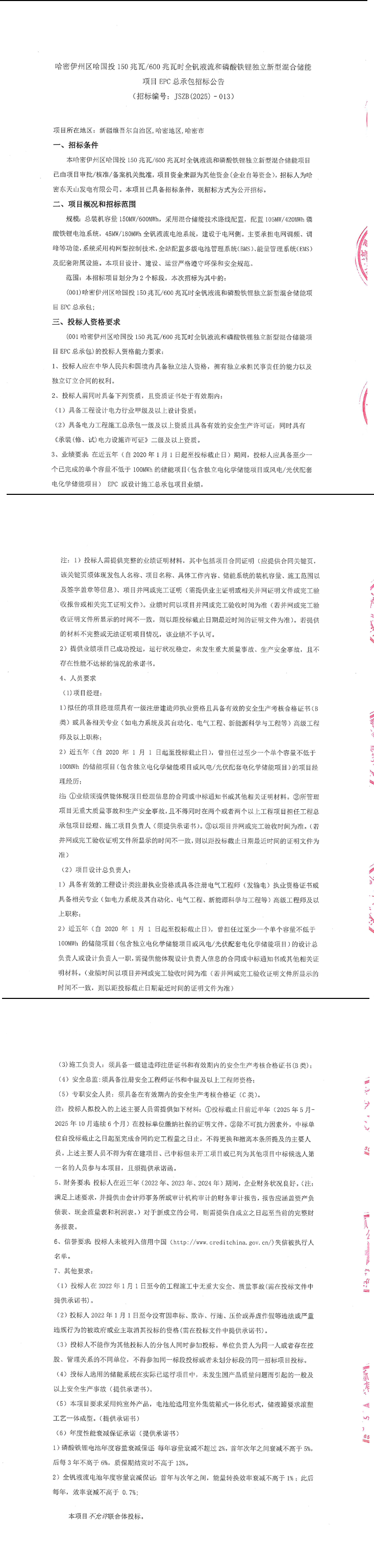 2025年11月,哈密东天山发电有限公司就哈密伊州区哈国投150MW/600MWh全钒液流和磷酸铁锂独立新型混合储能项目EPC总承包启动公开招标。