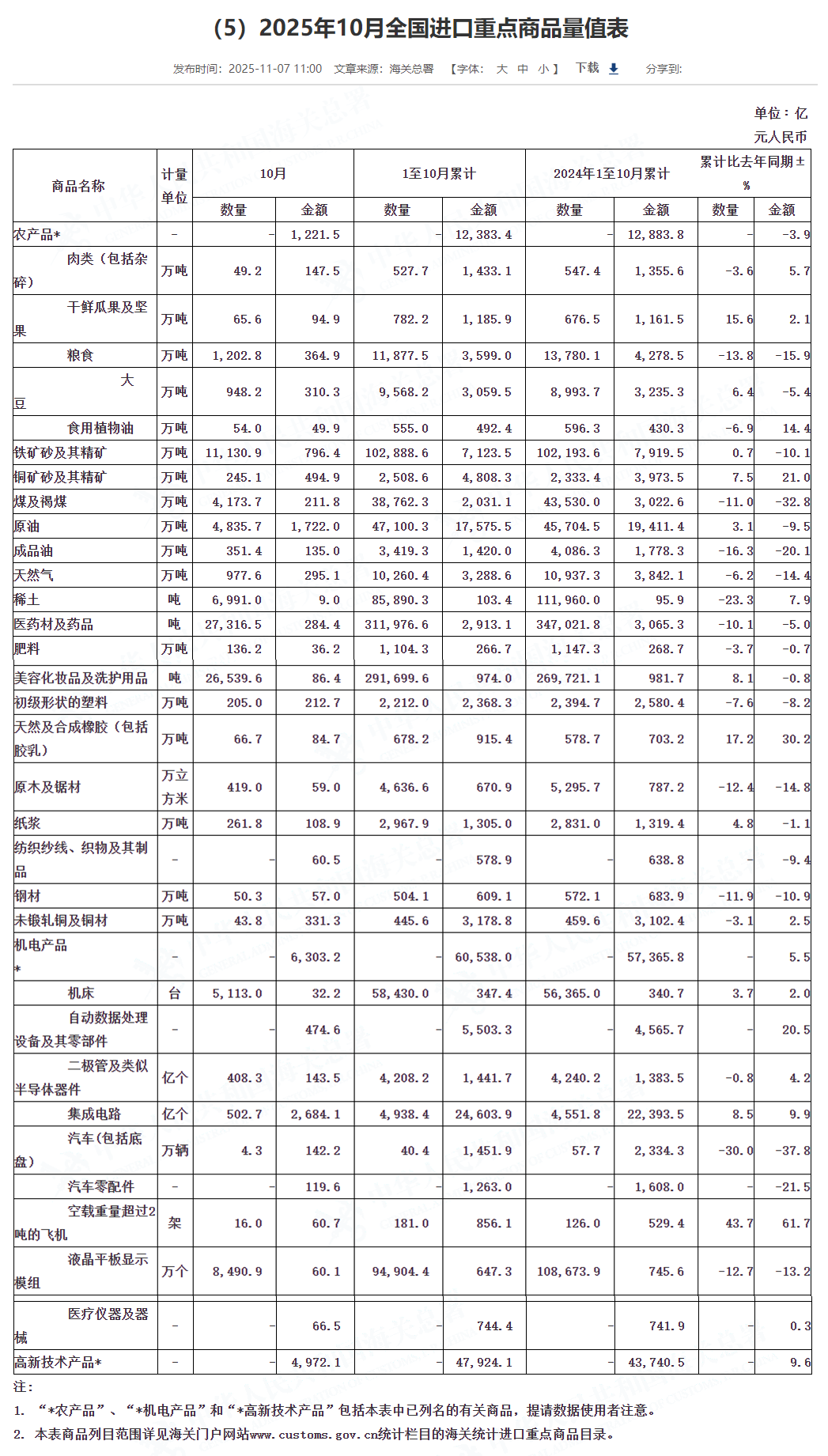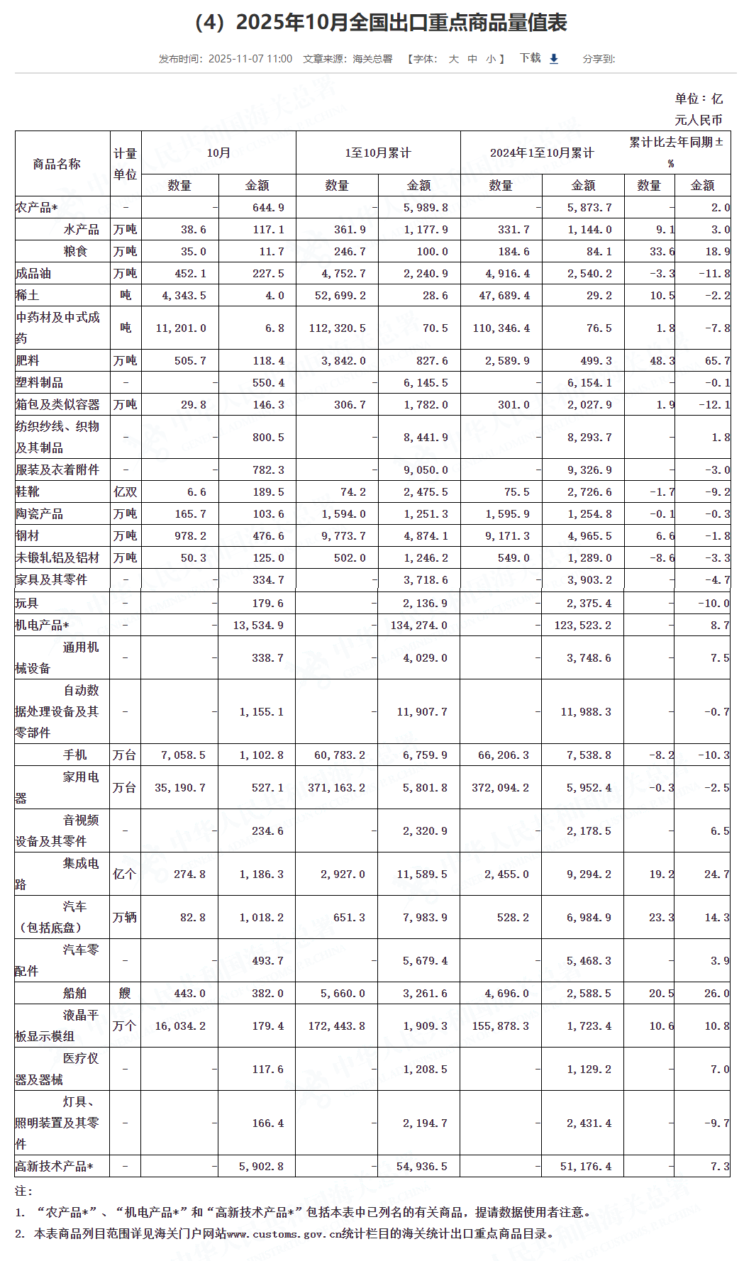 前10个月,我国出口机电产品13.43万亿元,增长8.7%,占我出口总值的60.7%。其中,自动数据处理设备及其零部件1.19万亿元,下降0.7%;集成电路1.16万亿元,增长24.7%;汽车7983.9亿元,增长14.3%。同期,出口劳密产品3.38万亿元,下降3%,占我出口总值的15.3%。其中,服装及衣着附件9050亿元,下降3%;纺织品8441.9亿元,增长1.8%;塑料制品6145.5亿元,下降0.1%。出口农产品5989.8亿元,增长2%。