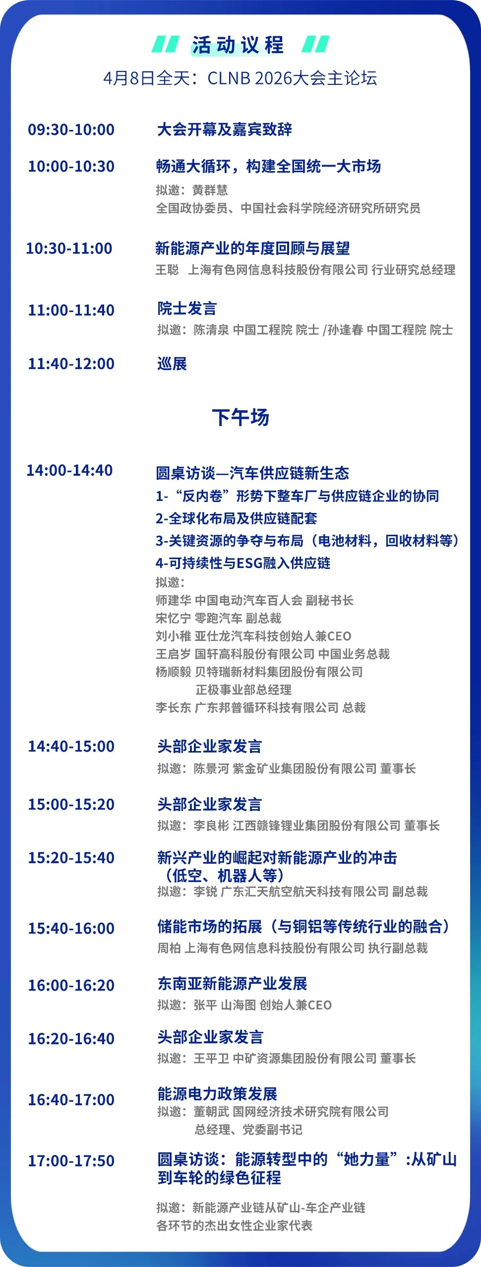 拟邀嘉宾包括中国工程院院士陈清泉、孙逢春,以及紫金矿业董事长陈景河、赣锋锂业董事长李良彬等头部企业领袖。同时邀请上海有色网、零跑汽车、国轩高科、贝特瑞等产业链代表分享实战经验。论坛设置开幕致辞、院士发言、圆桌访谈、头部企业家演讲、巡展互动等环节,旨在搭建跨领域交流平台,助力产业生态共赢。