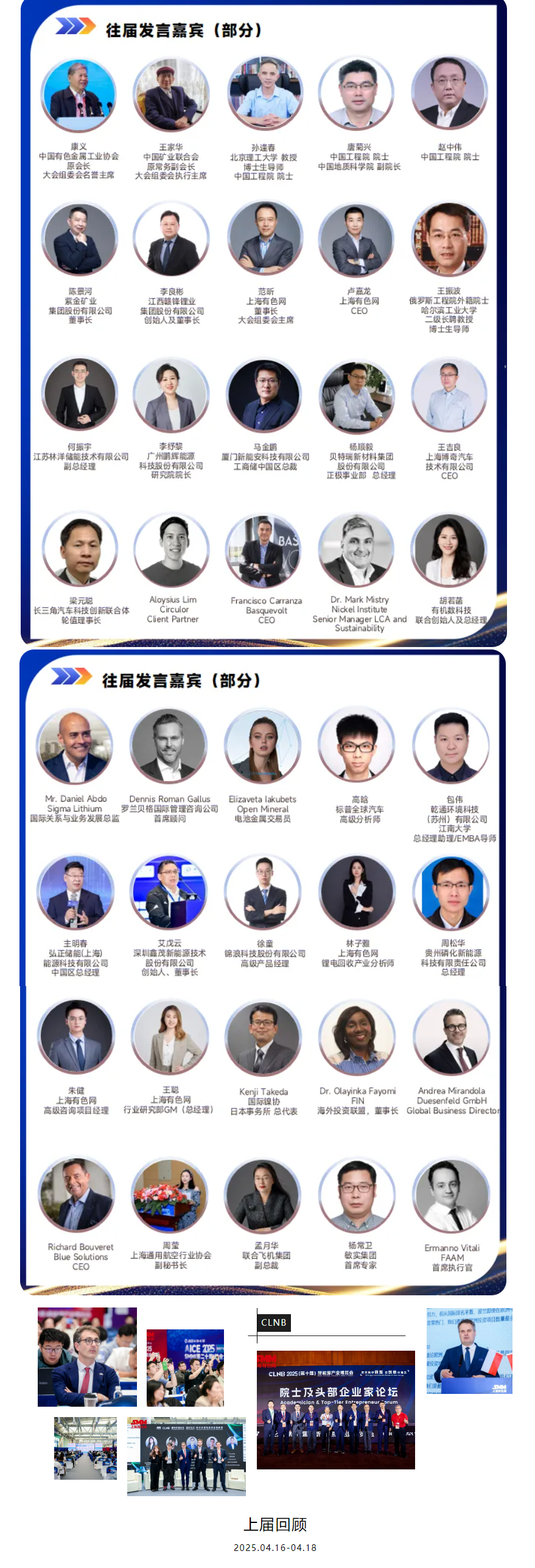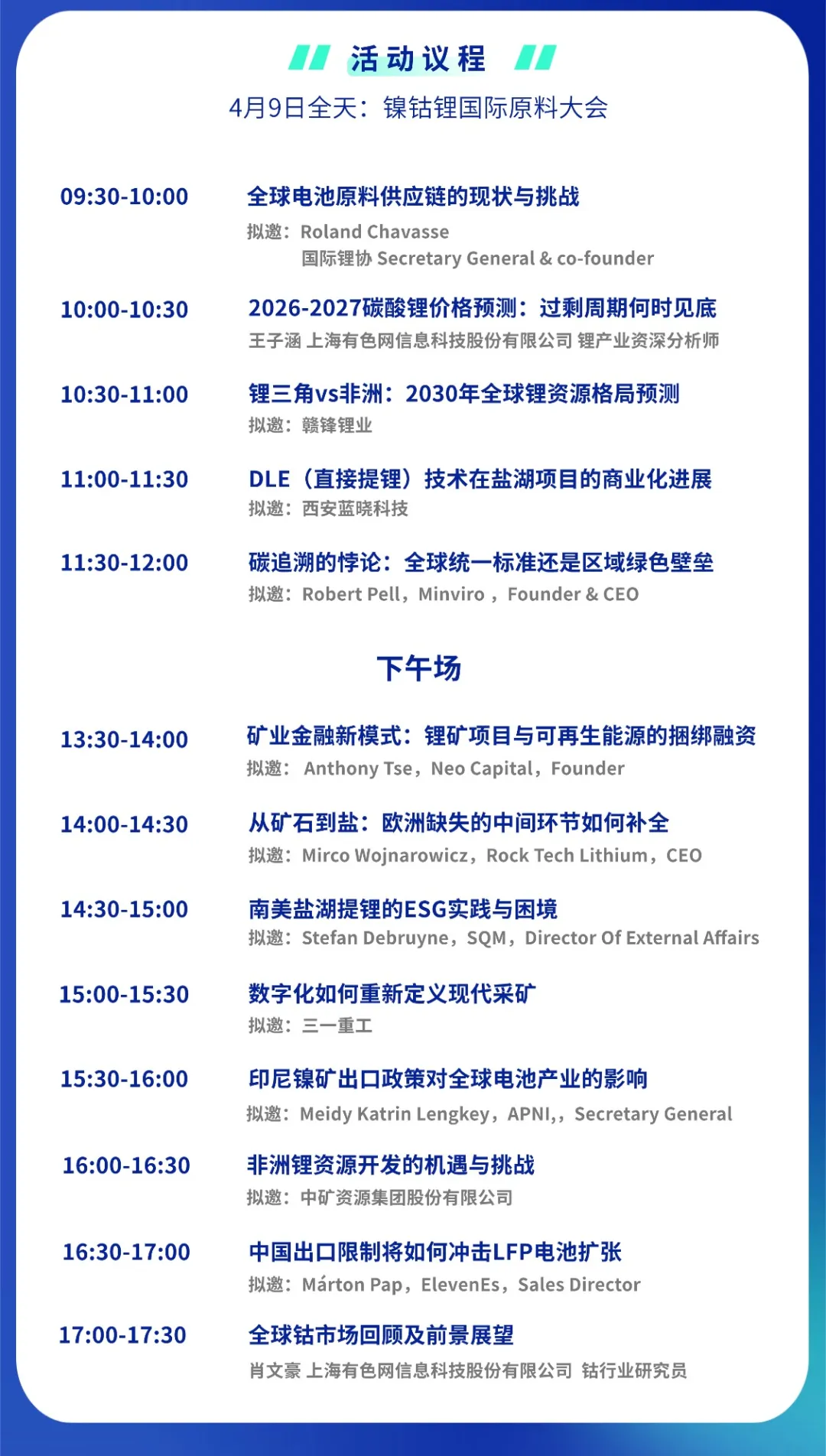 为深入探讨全球电池原料供应链的现状与未来趋势,本次论坛汇聚国际行业协会、头部企业、技术专家与资本领袖,聚焦锂、镍、钴等关键资源,共话产业可持续发展路径。