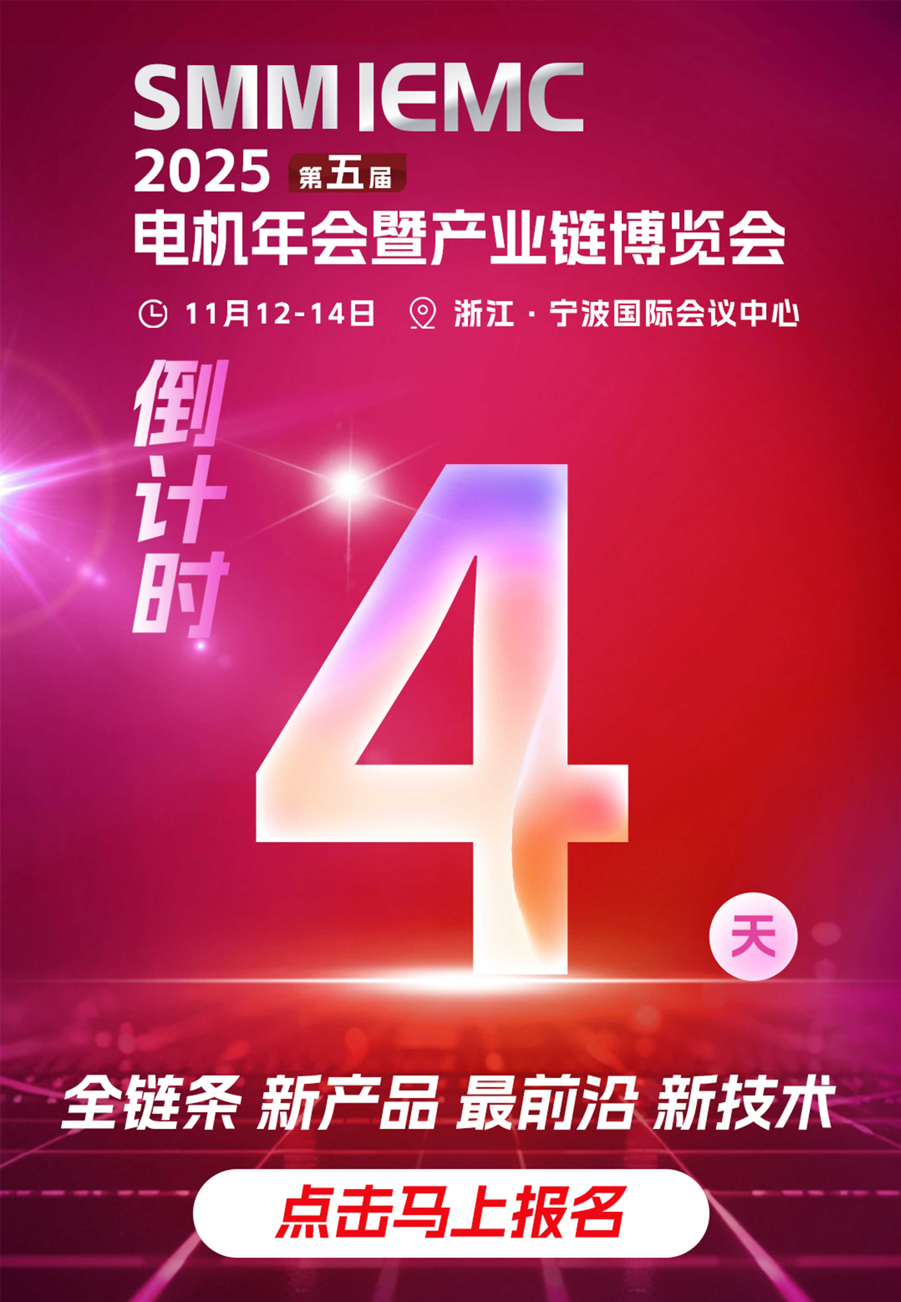 2025年11月12-14日,SMM 2025 IEMC(第五届)电机年会暨产业链博览会在浙江·宁波国际会议中心盛大启幕!本届展会深度赋能电机全产业链生态,全维展示电机/电机控制系统及装置/线圈配套及材料/机器人/测试仪器及设备等核心领域!创新打造3大主题活动+7大行业论坛矩阵。即刻点击报名,与行业同仁携手共创电机产业更加灿烂的未来!