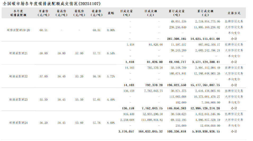 2025年1月1日至11月7日,全国碳市场碳排放配额成交量148,896,989吨,成交额9,248,937,296.08元。